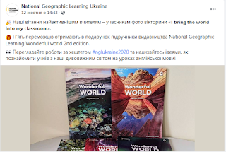 1. Publish a series of photos (4-5 pieces) on the topic “I bring the world into my classroom” 2. Be sure to add # NGLUkraine2020 to the description so we can find you. 3. The period of participation is from 15.09 to 27.09 2020. 4. On September 28, 2020 we will choose 6 winners 5. The winners will receive a textbook as a gift.
